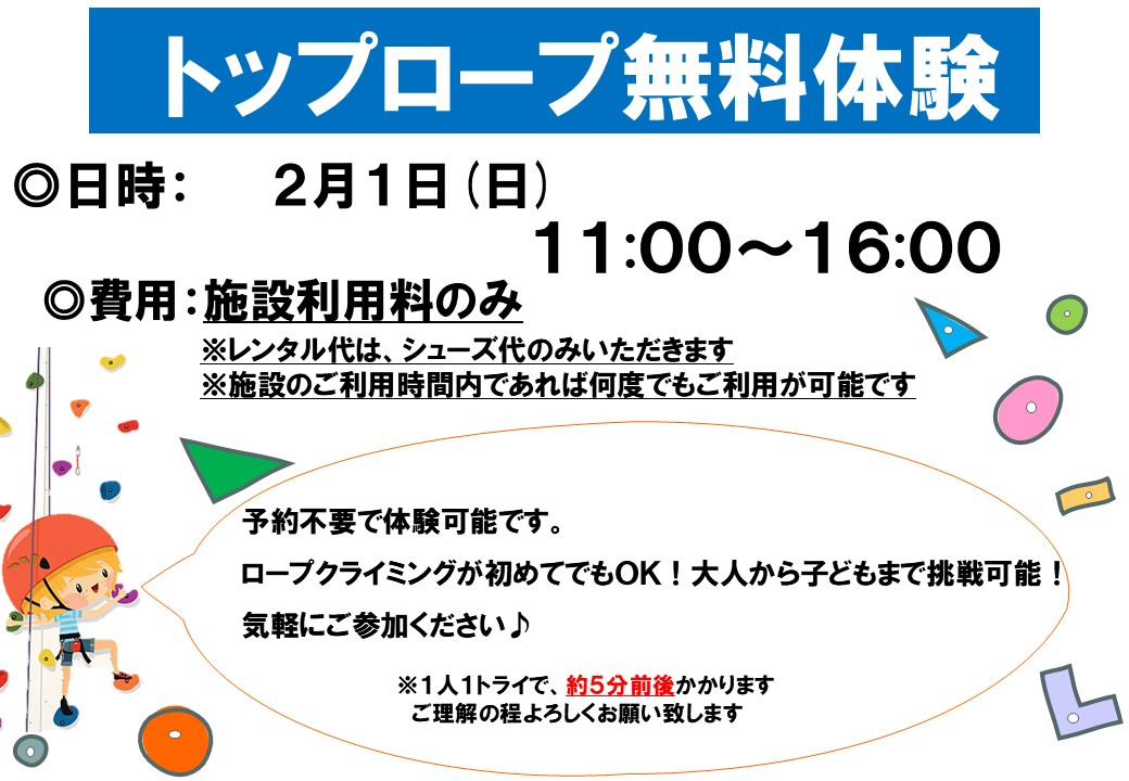 トップロープ無料体験を開催いたします。