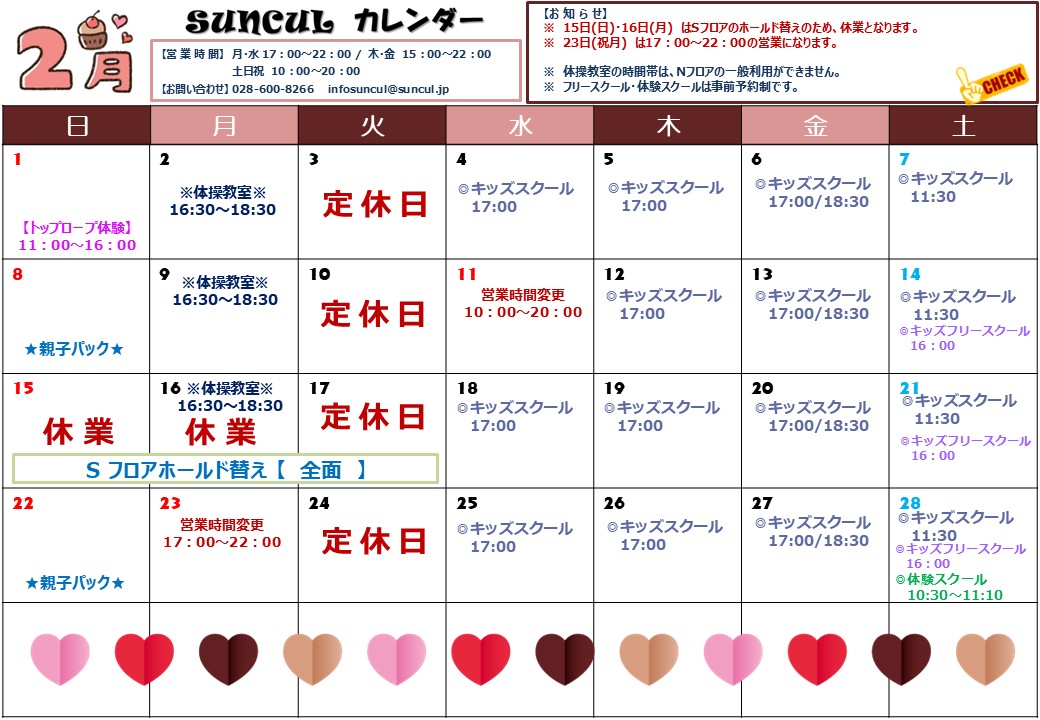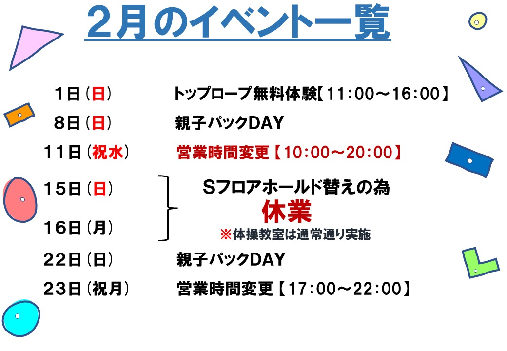 2月のカレンダーとイベント一覧です。